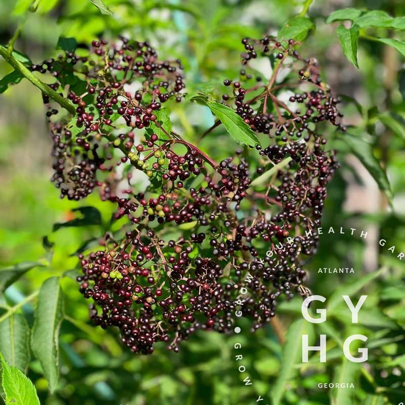 • Stop buying dried elderberry kits or already made elderberry syrup and have access to them right in your yard! These elderberry bushes are a vigorous hardy plants that have beautiful glossy green foliage. In May they develop large white flower-heads (see picture). Flower heads can be harvested to use in teas or to dry and use medicinally. Flowers that are not harvested develop into exceptional, large fruit clusters in the summer come early July in our Zone 7B.